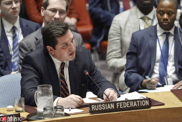 当地时间2017年4月12日,美国纽约,联合国安理会12日就英法美提出的叙利亚化学武器问题决议草案举行表决,俄罗斯又一次使用了否决权,草案没有通过,当英国代表呵斥俄罗斯滥用否决权支持叙利亚使用化学武器时,俄罗斯代表先是怼回去,然后用命令的口吻说:看着我的眼睛,眼睛不要走神,你往哪里看呢...