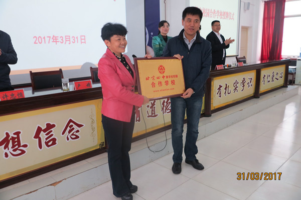 黄向伟向贞丰中学授予“北京四中数字校园合作学校”牌并讲话。他指出,多年来,民盟充分发挥组织的智力和教育资源优势,持之以恒地关心国家的教育改革与发展。北京四中网校依托现代教育技术与现代教育理念,汇集了优秀教育教学资源,拥有众多北京四中一线名师提供的优秀微课,同时开发了适合教师课堂教学的教学软件和教学平台。近年来,四中网校与许多学校合作探讨“互联网+教育”,形成了将信息技术与课堂教学深度融合的富有成效的教学模式,可以让学生的学习更加有效,效率更加提升。我们愿意与贞丰教育同行一起,帮助同学们健康成长、走出大山、回报家乡。