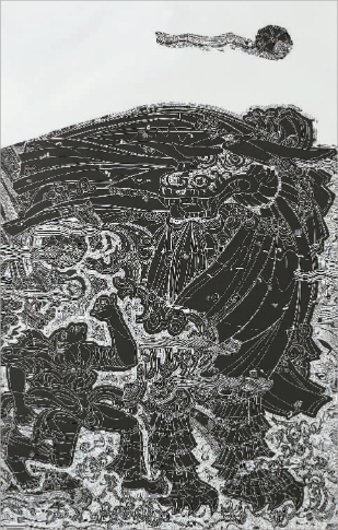 以作品进行精神反思是艺术家的责任感和使命感的体现。戴政生的作品不仅关注传统与现代对话,更关注自然、时间、生命的价值本源。在其创作中,以写意的木刻手法融贯自由想象之中。从《人类后风景》到《回忆长江》 ,从《创造三峡》到《神·门·人》 ,内容从嘉陵江到长江三峡,从大足石刻到梁平木版年画,篇幅愈来愈大,题材亦不断拓展到对人类无休止的战争、对自然疯狂掠夺行为的检讨、对自然和文化的敬畏。这些作品以象征写实的手法,新图式语素的表达,以巨幅黑白强对比的画面呈现出艺术家的精神世界。