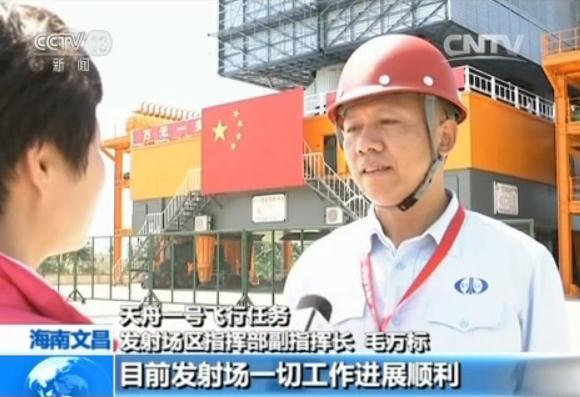 天舟一号飞行任务发射场区指挥部副指挥长 毛万标:船箭组合体转运到发射塔架,意味着这次任务进入到了最后的决战阶段,目前发射场一切工作,进展顺利,我们已经为最后的加注发射阶段做好了准备。