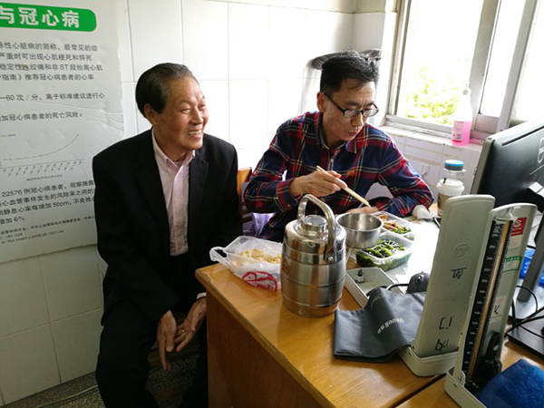 从4月10日开始,在东南大学附属中大医院(下简称中大医院)心血管内科门诊部,常能看到这样暖心一幕:一位老人,笑呵呵地坐在一旁,看着身边的医生吃饭,氛围安静而温馨。