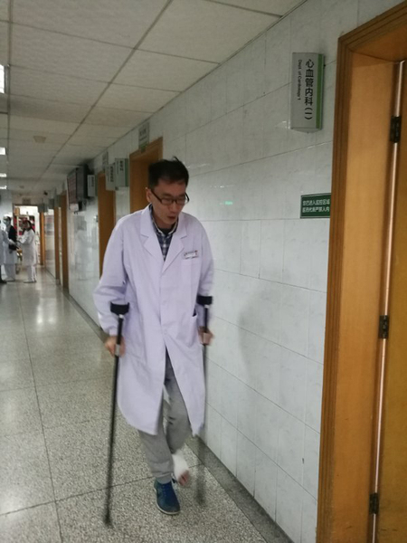 现在,脚上打着石膏,王宇平均每天还要接诊100多人,从早晨7点50分开诊,忙到下午5点。一坐就是几个小时,长时间的血液不流通,他的脚出现局部水肿。因为休息时间有限,王宇就利用中间上厕所的空闲,拄拐活动一下。