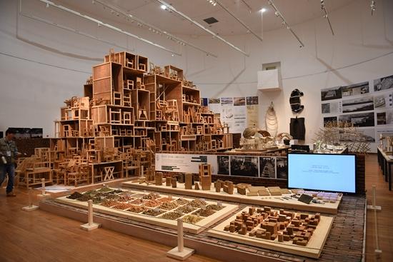 王澍要求学生必须动手,甚至是亲手堆夯土,因为“拿一把土在手上,和在纸上写下‘土’字,完全是两回事”。在本次展览的显眼位置,有一座高至天花板的“椅山”。王澍要求一年级新生上木工课,学榫卯,期末每人做一把椅子——不是模型,是实实在在的一把木椅子——能坐的那种。10年下来,学生的椅子堆成了山。