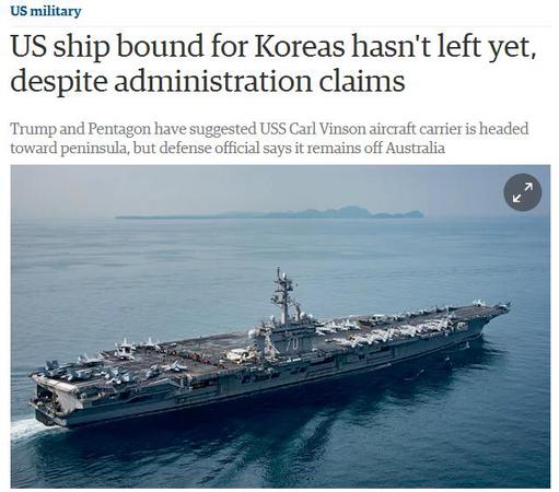 美国海军4月8日宣布该航母带领的战斗群正“向北航行”,这是威慑朝鲜的“审慎”措施。11日,美国国防部长马蒂斯说卡尔?文森号“正驶往”朝鲜半岛。12日,美国总统特朗普说,“我们正派出一大舰队,非常强大”。上周末,美国副总统彭斯前往“三八线”说,美对朝已无“战略耐心”。