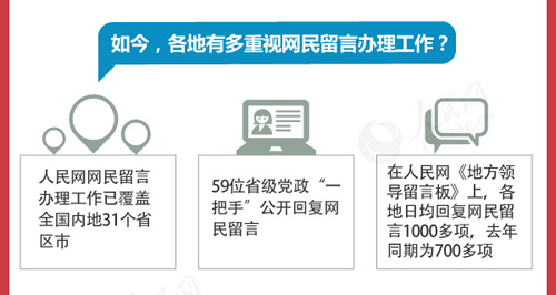 总书记发出“上网令”这一年来,海南、宁夏先后下发文件,通过制度化的形式办理网民留言,建立起办理人民网网民留言固定工作机制的省份数量达到22个;北京、江苏也正在积极推动此项工作。云南、青海两个省,则对原有文件进行更新,要求进一步做好网民留言办理工作,力求疏通为民解忧的快速通道。