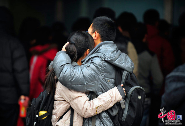 一对情侣在进站口前紧紧相拥。(宁峰/中国网)