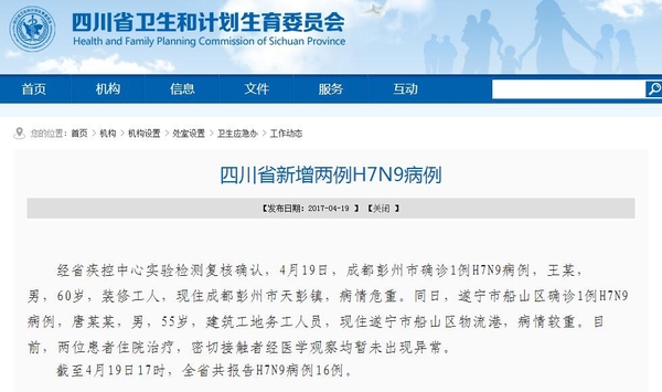 截至4月19日17时,四川省共报告H7N9病例16例。