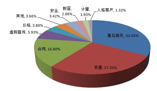 根据投诉性质分析,售后服务问题占33.03%,消费者投诉质量问题占27.35%,合同问题占16.80%,价格问题占3.89%,虚假宣传问题占5.93%,安全问题占3.42%,假冒问题占2.66%,计量问题占1.93%,人格尊严问题占1.33%,其他问题占3.66%。售后服务、产品质量和合同问题仍是引发投诉的主要原因,占投诉总量的七成以上。