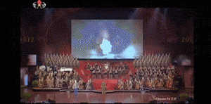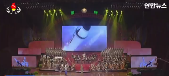 据报道,当功勋国家合唱团男声独唱《和平出自我们的枪杆》时,银幕上开始播放朝鲜北极星-2号导弹发射的画面。