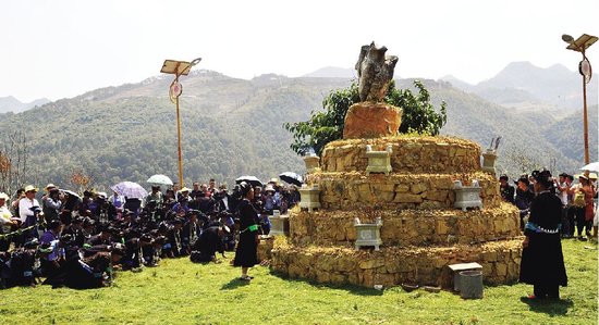 摆设好供品,“博丙”对着太阳神位诵祭词:“今天是吉日,今天是女人日,是祭太阳神的日子……”女人们庄重地聚集在太阳神位旁,唱《祭太阳古歌》,将“太阳”送回天上。