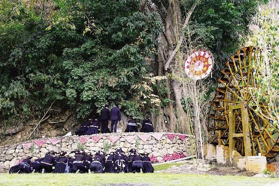 上午9点半,我们来到村头大榕树下。参天大榕树上,挂着壮族特制的“太阳”,这就是太阳神树。村中生态墙上,贴着“祭太阳、唱古歌、敬鸟母、同祈?!钡奶醴?。神树旁边箐沟里,古老的水车不停地把清澈的山泉水送向远方。我们紧随祭祀的队伍前行,一点一点揭开“女子太阳节”神秘的面纱。