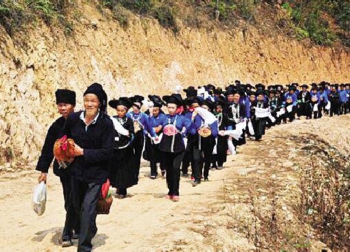 净身仪式结束后,成年女性们手持白手巾,吆喝着“岔着唐温罗”(壮语意为“找到太阳了”),聚集到河边的神树(传说太阳藏身的树林)祭台前,由“博丙”(壮语意为专司此祭祀活动的年长者)带领大家祭请太阳。请出“太阳”后,用轿子抬着“太阳”,带着祭品,前往“波唐温”(壮语意为“太阳山”),女人们唱着古歌,向“太阳山”祭祀场地前行。
