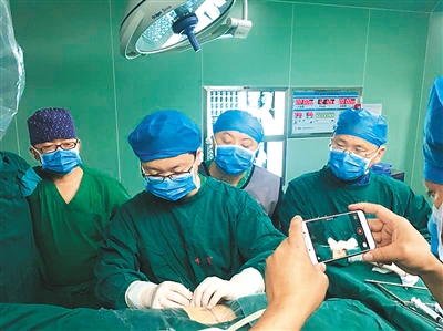 江晓兵(右)去伽师县会诊一例脊柱骨折急诊手术时,由于手术室空调损坏,在高温下实施近3小时手术,手术快结束前由于出汗多,差点虚脱。凌晨两点三十五分,幸亏有老大夫建议自制简易吸管,在不污染术衣的情况下补充了液体,之后顺利完成骨折手术。