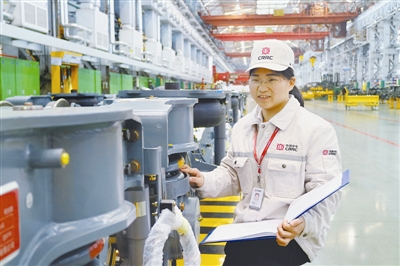 曾艳梅在转向架制造现场检查。韩艺 摄