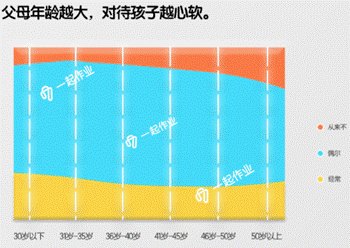 一起作业在调查中也发现:年龄越低的家长越爱吼叫孩子,30岁以下的家长中经常吼孩子的比例占到28%,比其他年龄段的家长都要频繁;而在从来不会吼叫孩子的家长中,50岁以上的比例最高,达到24%,而30岁以下的只有11%??杉桓鋈说脑睦椭腔?,跟脾气成反比。对于大部分30岁以下的新手父母来讲,自己还是个宝宝,实在很难教育好另一个宝宝啊,大吼大叫也在所难免。