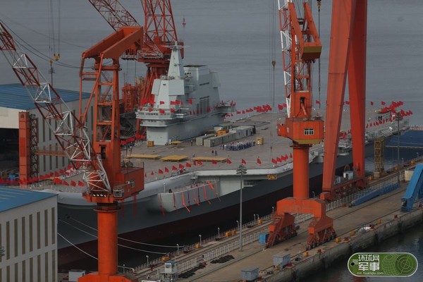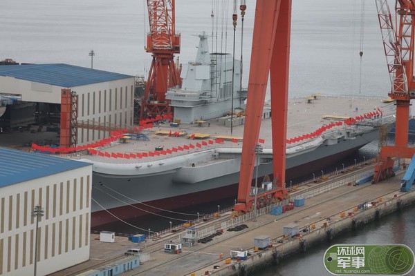 根据此前报道,船坞中注水完毕,目前国产航母实际已经是浮在水上,正等待船坞闸口开启后被拖出船坞。据介绍,对于航母这类巨无霸来说,这种船坞注水漂浮的下水方法更为稳妥,可以有效减少下水时的巨大冲击力,并检验所有水下舱室是否漏水。之前美国新一代核动力航母“福特”号也是采用同样的下水方法。