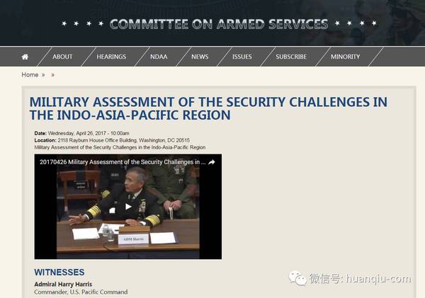哈里斯在美国众议院出席题为“印度 - 亚太地区安全挑战的军事评估”的听证会。来源:美国众议院官网