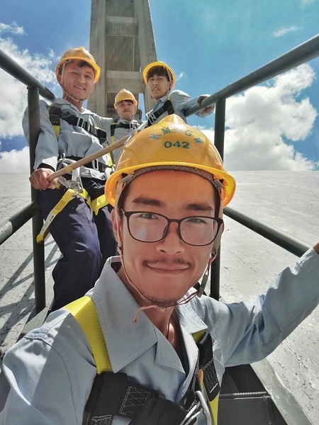 昆明南工务段弥勒桥路工区工长赵云龙与90后工友们在南盘江特大桥拱圈上合影。昆明铁路局供图 邓瑜 摄