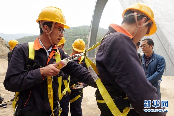 作为工长,赵云龙表示自己与同龄工友们的相处更像是“兄弟、亲人”。图为上桥作业前,赵云龙(前左一)帮助工友检查安全带。新华网 聂晨静 摄