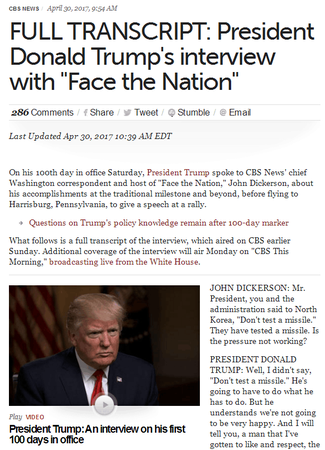 【环球网报道 记者 乌元春】美国总统唐纳德?特朗普4月29日执政满一百天。在这一天,特朗普接受了美国哥伦比亚广播公司(CBS)“面向全国”(Face the Nation)的电视专访。在30日播出的专访中,特朗普谈到了自己执政百日的成就,还提及朝鲜领导人金正恩,认为他是个“相当聪明的家伙”(a pretty smart cookie)。他还表示,朝鲜终将发展出更为精良的导弹系统,“我们不能让此事发生”。