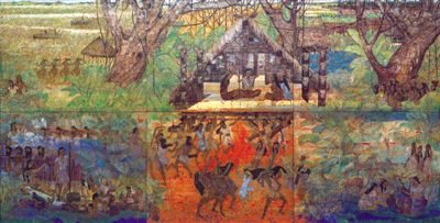 作为历史题材美术创作,《河姆渡文化》不仅要反映几千年长江中下游流域氏族的情况,还要突破固有思维对“真实历史”的认知局限,以非还原的手法使构思的真实性与内容的浪漫性在现代与古代信息点上穿梭往返,使想象与现实、历史与考古有机结合,变成艺术家创造性想象的新历史绘画。因此,《河姆渡文化》在尊重历史的基础上以纵向和横向两条考察线索进入——纵向上透过河姆渡文化遗址的历史叠压层的文化印记看历史,横向上感受考古清理出的各类生活用品看现象,在那里,人类文明的技艺与生活经验不断传递,烙下中华民族心理的印痕?!逗幽范晌幕氛庵只乖返姆绞?,不是历史的再现,更不是图解,而是现代人对于历史的重新演绎和创造,是艺术的历史现实。