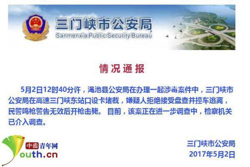 5月2日下午,三门峡市公安局通过官方微信对外通报称,5月2日12时40分许,渑池县公安局在办理一起涉毒案件中,三门峡市公安局在高速三门峡东站口设卡堵截,嫌疑人拒绝接受盘查并撞车逃离,民警鸣枪警告无效后开枪击毙。 目前,该案正在进一步调查中,检察机关已介入调查。