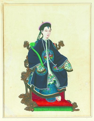 法国人不能确定这幅人物画像的身份,甚至有人名之曰“中国皇后像”,从画中各种服饰特征看,这根本不是皇后的装束。实际上,在1901年以前,西方商人和使节也见不到中国皇宫中的后妃?;裰泻芏嘞附谔卣鞑⒎峭耆斗缱接?,但当这些特征组合于一身时就显得荒诞走形了。应该说这是一幅想象中的中国贵妇人画像,并非写实。清代后妃和官员夫人们身着朝服袍褂时会佩戴三挂朝珠,画像中只画了左右两肩斜戴的两挂,缺了正中套在脖颈上的最重要的一挂。