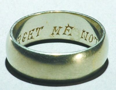 民国十一年,仍居住在故宫后寝区域的逊帝溥仪娶了内务府大臣郭布罗·荣源的女儿婉容。婉容和溥仪都接受过诗书和英文教育。这对年轻的贵族小夫妻性情投合,在生活方式上一起追逐时尚。他们的一对镍金戒指外圈光素,只在戒指内壁錾刻字样,一枚为英文“I LOVE YOU FORGET ME NOT”(我爱你,勿忘我),另一枚为汉字“允执厥中,惟精惟一”,此八字出自《尚书》,为清代帝王珍重的政治修养箴言,意喻帝王应信守中正,精纯专一。现在看来,这两枚戒指没有什么特别之处,但在当时也代表着一种新材质新风格的流行。
