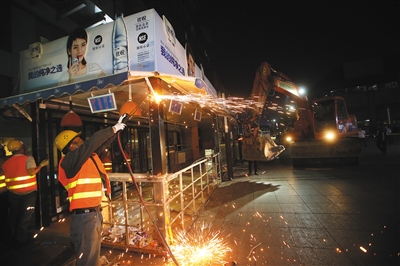 昨晚,工作人员正在对王府井步行街上的水吧进行撤场拆除。新京报记者 王贵彬 摄