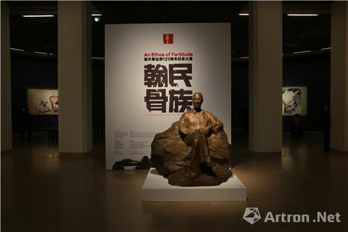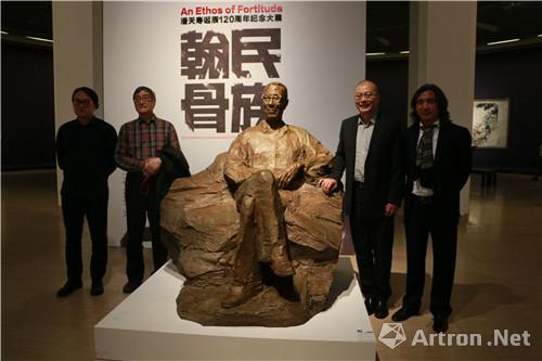 展览现场中国美术馆馆长吴为山、中国美术学院院长许江、艺术家潘公凯、 中国美术学院副院长高士明在潘天寿先生塑像前合影留念
