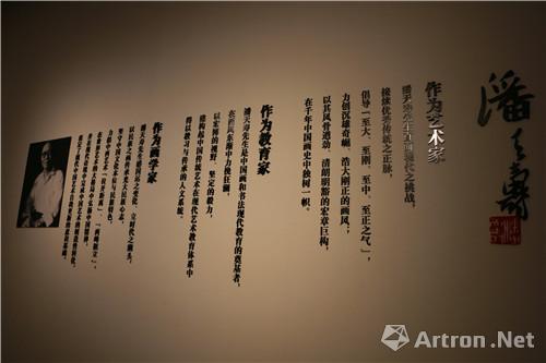 再加上圆厅后的弧形展厅和一间小厅,每一个版块以潘天寿的艺术核心和他的一枚印章来作为引题,用“高风峻骨”、“一味霸悍”、“奇崛明豁”、“雁荡山花”、“守常达变”、“饮水生涯”六大板块来梳理呈现潘天寿先生的代表巨作、手稿文献和笔墨成就,将研究、策展与展示结合,从潘天寿的艺术问题出发,将潘先生的画作、画论、诗词编织为一体,展示其艺术之成就及价值意义。