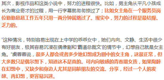 虞蓉蓉分析:首先,这是一个社会适应的问题。通过追剧、看文,在幻想中,把自己代入其中,现实中没有的部分能得到补偿。比如,现实生活中平凡的自己,可以在幻想中过上公主的生活;现实中父母离异,家庭温暖感缺少,可以被疯狂的爱弥补。