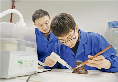 刘晓彬(右)与杨弢(左)正在清洗发掘出来的漆皮
