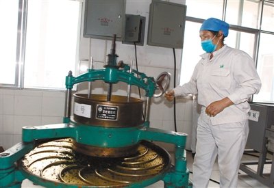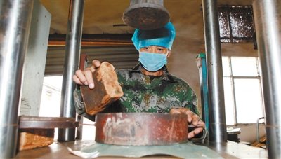 林芝市易贡茶场的工作人员在制作砖茶