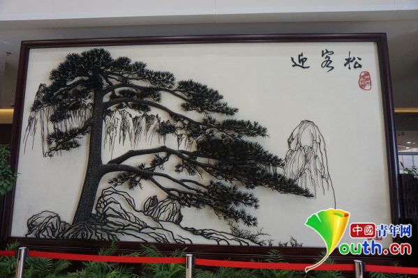陈设于人民大会堂接待厅内的巨幅传统铁画——《迎客松》,由叶合与其他工匠集体制作完成。中国青年网记者 杨月 摄
