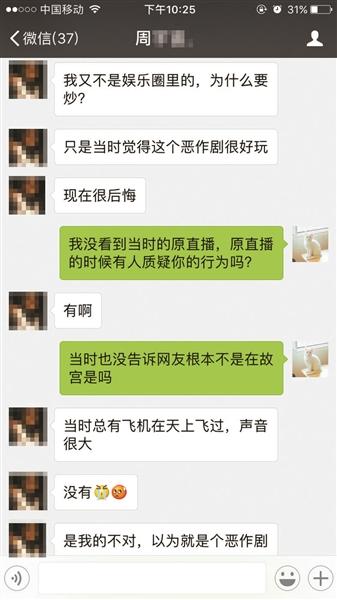 周女士:我想去故宫道歉,但是我真的担心他们会生气,因为我的一个无心的恶作剧造成了这么大的影响。本组文/本报记者 王天琪 屈畅