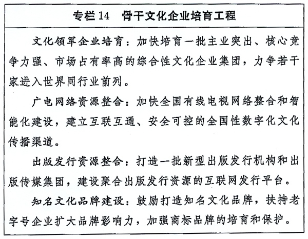 (一)发展壮大文化市场主体。发展骨干文化企业,推动产业关联度高、业务相近的国有文化企业联合重组,推动跨所有制并购重组。以党报党刊所属非时政类报刊、实力雄厚的行业报刊为龙头整合报刊资源,对长期经营困难的新闻出版单位实行关停并转。降低社会资本准入门槛,鼓励和引导非公有制文化企业发展。支持“专、精、特、新”中小微文化企业发展。