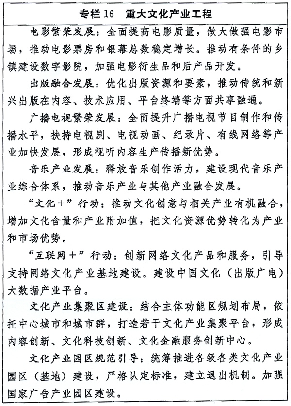 中共中央办公厅 国务院办公厅印发《国家“十三五”时期文化发展改革规划纲要》