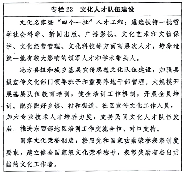 (二)培养造就高层次人才。加强领军人才建设,建立健全重大文化项目首席专家制度,培养集聚一批有深厚马克思主义理论素养、学贯中西的思想家和理论家,造就一批人民喜爱、有国际影响的学术大家、艺术大师和民族文化代表人物。加强新闻出版传媒领域高层次人才培养。实施中国特色新型智库高端人才培养计划,壮大公共政策研究和决策咨询队伍。加强文化产业投资运营、文化企业管理、媒体融合发展、网络信息服务等方面复合型人才、紧缺人才培养,多渠道引进海外优秀文化人才。