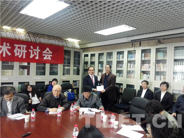 图为宗教研究院院长游斌为藏传佛教研究中心主任周拉教授颁发聘书