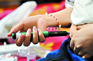 18岁的“地贫”少女钟娇娇在南宁市的姨妈的出租屋里为自己注射胰岛素,治疗“地贫”所引发的继发性糖尿病。新华社发