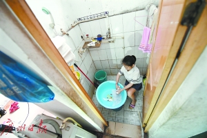 钟娇娇在姨妈的出租屋里洗衣服。新华社发