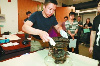 “高50厘米,宽45厘米乘30厘米,边沿修复处有裂,通体有锈。”工作人员凑近青铜器,边观察边报出文物当前情况,任何细节都不放过。