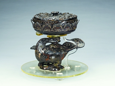 配支架,是因为此豆造型奇特:由莲花豆盘、鸟首、鸟身、鸟爪与蛇身分件制成,用榫卯连接和生漆粘接两种方法拼合。其中盘腹较深,口微敛,内壁弧,口沿平直。盘外壁上部一周浮雕十四瓣仰莲花。盘下以一凤鸟为柄,凤头后仰向上,鸟颈弯曲较长,凤冠呈倒式与鸟背相接,鸟嘴张开至极限,鸟嘴里衔住方形榫头,榫头插入盘底榫孔内。凤鸟站立于蛇身之上,鸟身、双翅、鸟尾、鸟腿用整木雕刻。鸟胸脯前倾呈圆弧形,双翅略张与鸟背平,鸟尾呈扇形,双腿并列略呈蹲立之势,两爪平齐抓住一条蜷伏的蛇。蛇身修长,蜷伏成“十”字形,蛇头向后而偏左侧,蛇尾较细长且后飘上翘至鸟尾下部中间呈支撑状,顶住鸟尾,以起支撑作用,这表明楚人在制作器物的过程中已能较好地运用物理学中受力平衡原理。“太精巧了,加上年代久远,已经不再适合受力,所以荆州博物馆特意给文物定制了支架承重?!?/p>