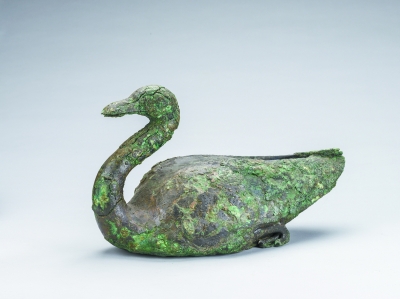 此次一件青铜雁到访首博,由于长时间潮湿环境的侵蚀,水禽周身锈蚀严重。“出土时青铜水禽都不同程度地保存有白色彩绘,可见,当时青铜水禽制作完成时,表面也施有彩绘?!弊宜担骸八嬖峥永镉腥嗽斓暮恿?,这些出土的青铜水禽或站或立,头部均朝向象征性的河道中央?!?/p>