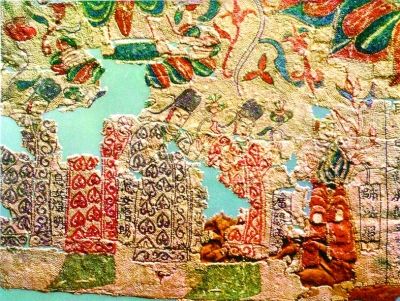 无独有偶,笔者去年5月参加深圳文博会时,与一位来自吉尔吉斯斯坦的擀毡学者进行交流,她向笔者展示了吉尔吉斯斯坦的毡绣作品,是一件将平绣针法与毛毡、丝绸等绣地结合起来的围巾绣品,造价不菲,这也是一种绣法的创造性使用。这些例子无疑又让我们更加理解汉唐时期,西域锦绣何以流行于中原王室和民间的原因。