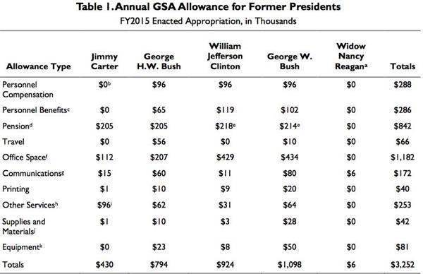 上述报告显示,2015年全年,吉米·卡特共得到43万美元,老布什全部退休津贴为79.4万美元,克林顿共拿到92.4万美元,而小布什的退休津贴高达109.8万美元。此外,里根的遗孀仅拿到6美元的通讯费用。