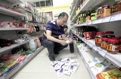 ▲ 5月9日,沙坪坝大学城某超市,盐业部门执法人员查获“脚臭盐”。 本报记者 雷键 摄
