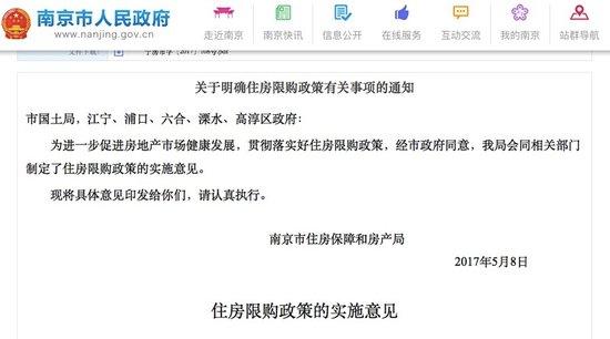 今年3月15日,南京市政府办公厅发布《关于进一步调整南京市住房限购政策的通知》,《通知》规定,从3月16日起,南京将高淳、溧水、六合纳入限购范围,暂停向已拥有1套及以上住房的非南京市户籍的家庭出售新房或二手房;南京主城区(不包括高淳区、溧水区、六合区)已拥有2套及以上南京户籍家庭不得购买新房或二手房。