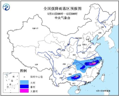 预计5月11日08时至12日08时,湖南东北部、湖北东南部、安徽南部、江西北部、浙江西北部、广西北部等地的部分地区有暴雨,局地有大暴雨(100~140毫米),上述部分地区并伴有短时强降水、雷暴大风或冰雹等强对流天气,小时雨强20~40毫米,最大可达50毫米以上。
